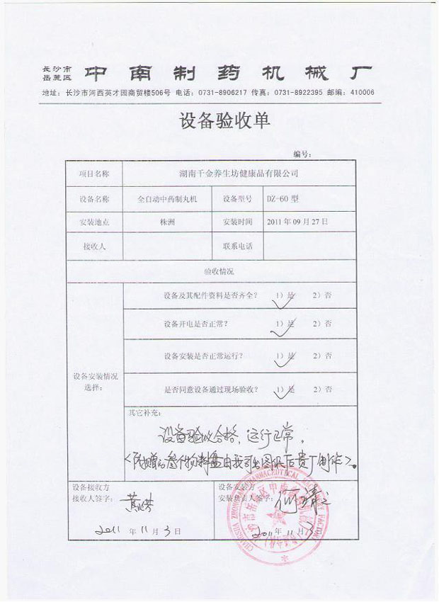 2011年10月,湖南株洲千金養(yǎng)生坊健康品有限公司向我廠購(gòu)買了DZ-60型全自動(dòng)制丸機(jī)、ZKB-K型顆粒包裝機(jī)、LM型煉蜜機(jī)、RXH-48盤熱循環(huán)烘箱、KZ-180型快速整粒機(jī)、CH-200型混合機(jī)、YK-160型重型顆粒機(jī)、GF-30B型帶除塵渦輪自冷式粉碎機(jī)組等設(shè)備,F(xiàn)已投入使用。