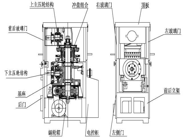7 罩殼部分:該機(jī)外殼為全封閉,符合GMP 要求。上半部分有四扇視窗圍城,便于清掃和維修。下半部分有不銹鋼門封閉,在一般情況下是鎖緊關(guān)閉的,只有在維修和安裝沖模時(shí)才打開此門。機(jī)器的正面安裝一操作臺(tái)。壓片室與機(jī)器傳動(dòng)部分由不銹鋼圍罩隔開,保證壓片室清潔及保護(hù)傳動(dòng)零件免受粉末污染、腐蝕。