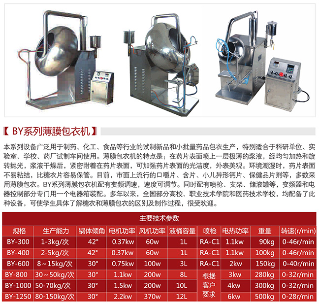 BY-300薄膜包衣機的特點是:在藥片表面噴上一層極薄的漿液,經(jīng)均勻加熱和旋轉(zhuǎn)拋光,漿液干燥后,緊密附著在藥片表面,可加強藥片表面的光潔度,外表美觀。環(huán)境潮濕時,藥片表面不易粘結(jié),比糖衣片容易保管。目前,市面上流行的口嚼片、含片、小兒異形鈣片、保健品片劑等,多數(shù)采用薄膜包衣。