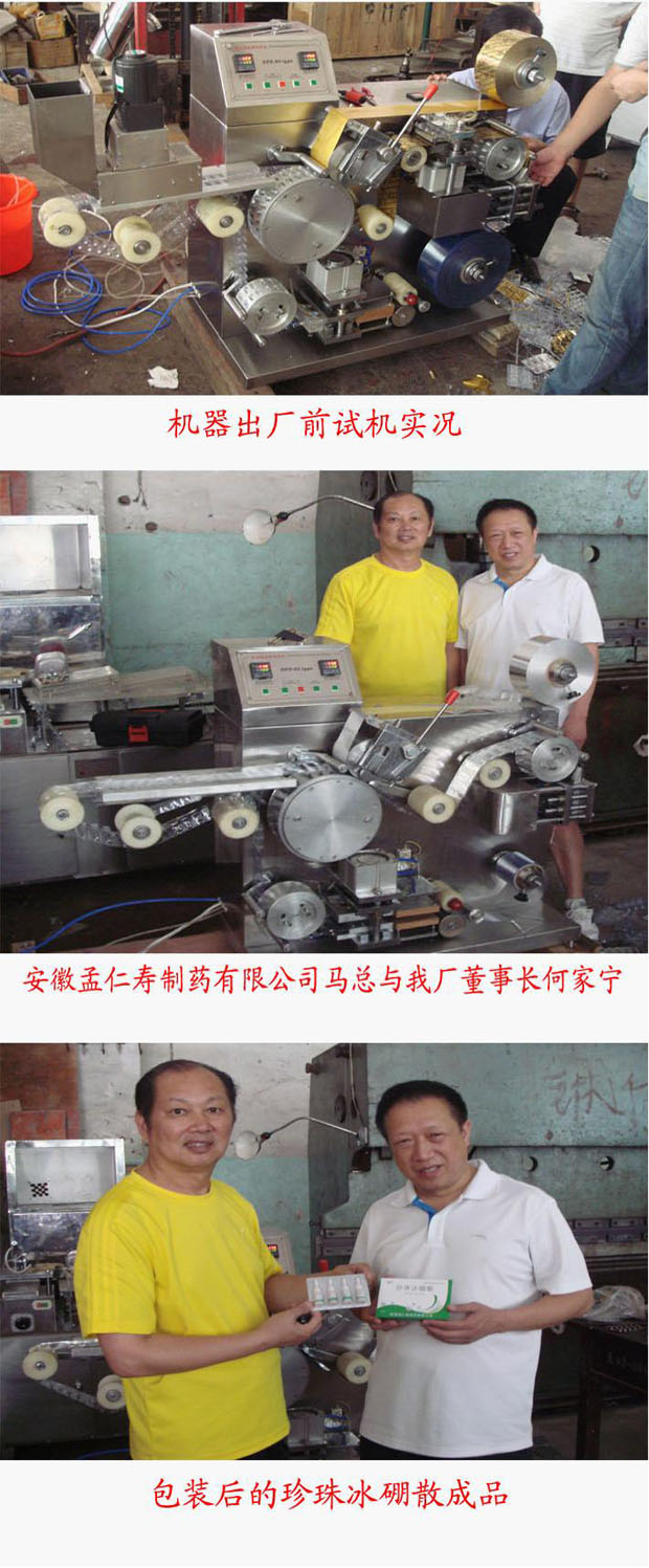 2010年7月,安徽孟仁壽制藥有限公司向我廠購買DPH-90異形物料大尺寸鋁塑包裝機(jī),用于包裝珍珠冰硼散(塑料瓶裝,4支/版)