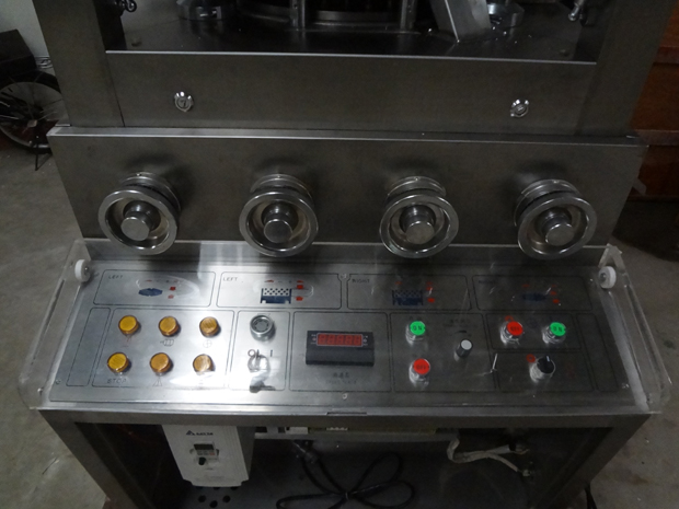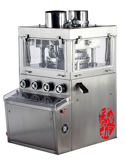 本機(jī)是一種雙壓式自動(dòng)旋轉(zhuǎn)、連續(xù)壓片的機(jī)器,將顆粒狀原料壓制成片劑,主要用于制藥工業(yè)的片劑生產(chǎn),同時(shí)適用于化工、食品、電子等工業(yè)部門。外圍罩殼為全封閉式,材料采用不銹鋼,能保持表面光澤與防止交叉污染,符合GMP要求。裝有透明玻璃的門窗,能清楚觀察壓片的狀態(tài),并且能全部打開,易于內(nèi)部清洗和保養(yǎng)。采用變頻調(diào)速裝置進(jìn)行電氣調(diào)速,操作方便,轉(zhuǎn)動(dòng)平穩(wěn),安全準(zhǔn)確。液壓系統(tǒng)設(shè)計(jì)合理,能保證液壓系統(tǒng)的穩(wěn)定。配有過載保護(hù)裝置,當(dāng)壓力過載時(shí),能自動(dòng)停機(jī)。沖模可與ZP19、ZP33、ZP35壓片機(jī)通用。